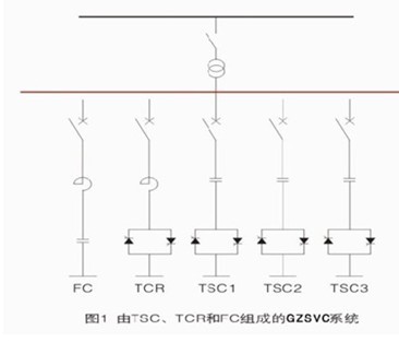 GZSVC一般由并聯(lián)的感性和容性兩大回路夠成,其中至少一個(gè)回路為動(dòng)態(tài)回路,能根據(jù)補(bǔ)償要求快速變化其無(wú)功功率;通常采用晶閘管控制電抗器(TCR)或晶閘管投切電容器(TSC), 容性回路采用固定電容器組或?yàn)V波器組(FC),如圖所示。TSC是分級(jí)投切的,不像TCR由相角控制,恰當(dāng)?shù)呐浜希琓SC和TCR可以連續(xù)控制無(wú)功輸出。