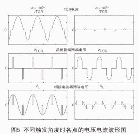 TCR正常工作時(shí)的觸發(fā)角范圍為90度—180度。當(dāng)觸發(fā)角不是90度時(shí),電流波形并非正弦波。不同觸發(fā)角度時(shí)各點(diǎn)的電壓電流波形如圖5所示。
